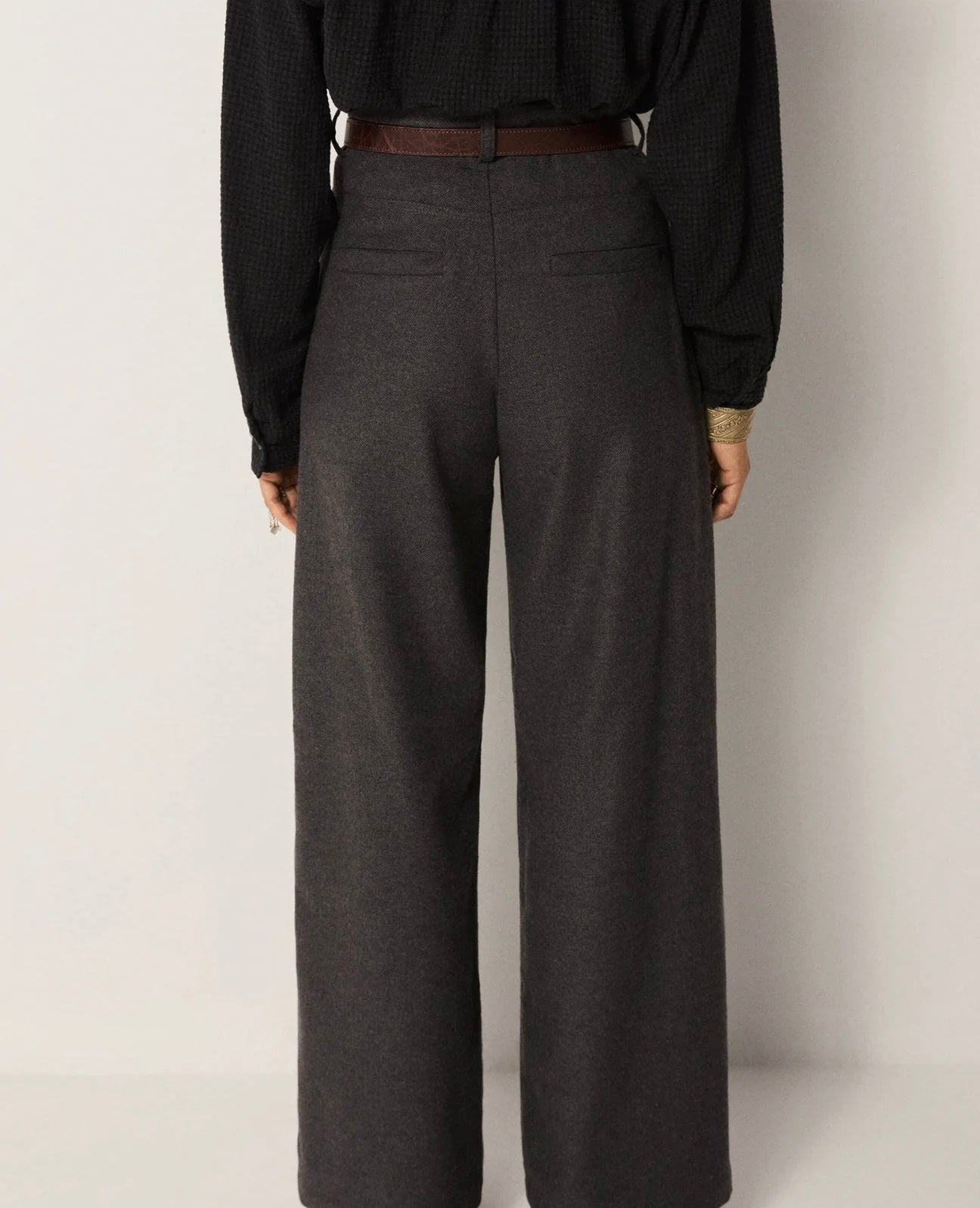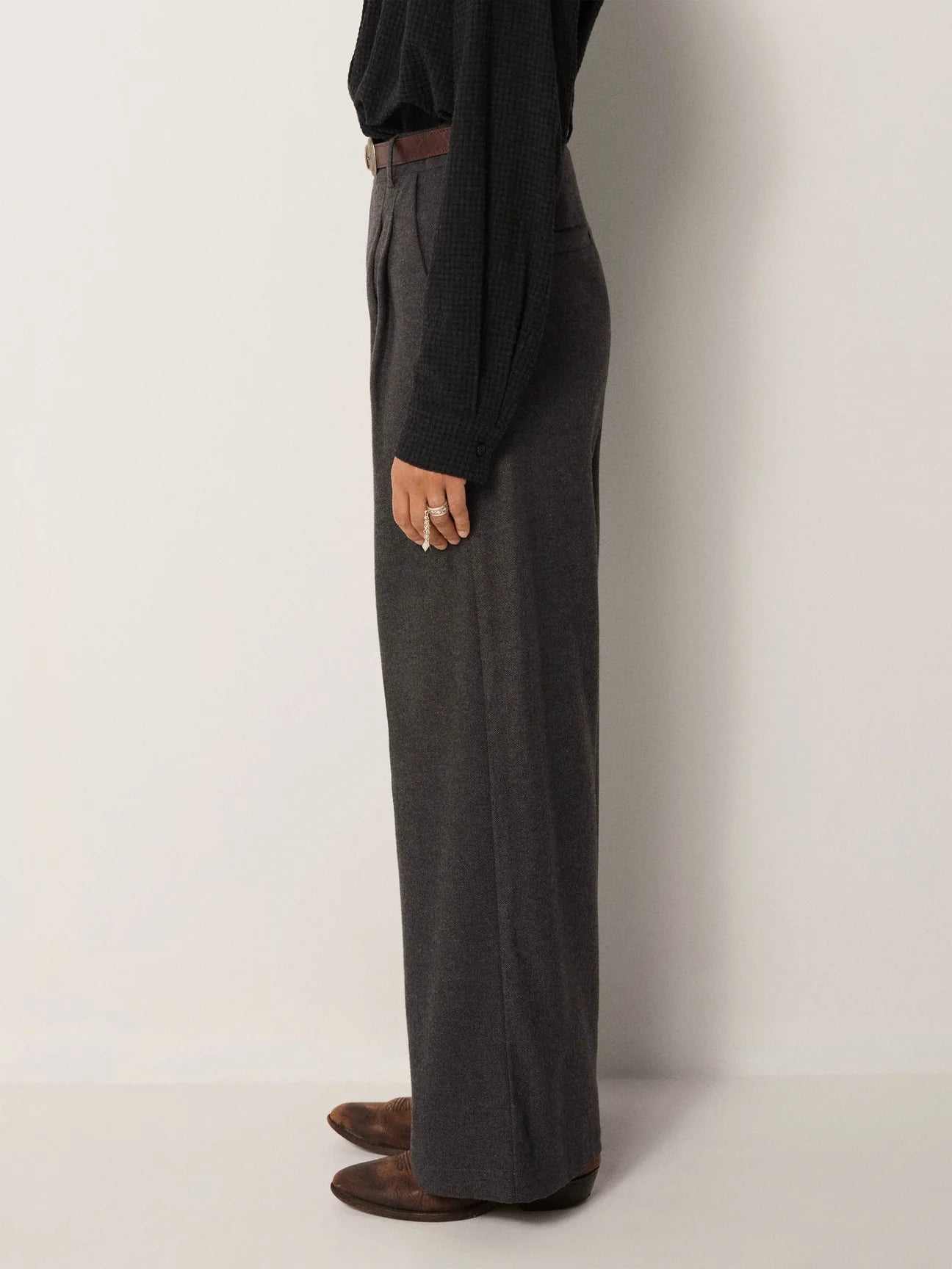 Front pleats and a wide-leg shape create a precise but relaxed cut, carrying elegance without rigidity.